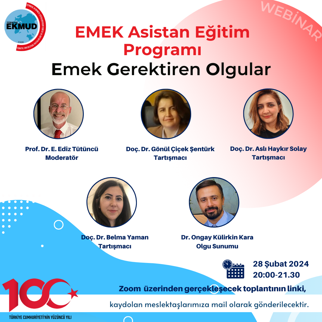 Emek Gerektiren Olgular (EGO)'ın 5. si 28 Şubat 2024, Çarşamba günü 20.00- 21.30'da yapılacaktır. Toplantı, Prof. Dr. E. Ediz Tütüncü moderatörlüğünde, Dr. Ongay Külirkin Kara'nın olgu sunumu ve Doç. Dr. Gönül Çiçek Şentürk, Doç. Dr. Aslı Haykır Solay, Doç. Dr. Belma Yaman tartışmacı olarak katılımı ile gerçekleşecektir.
