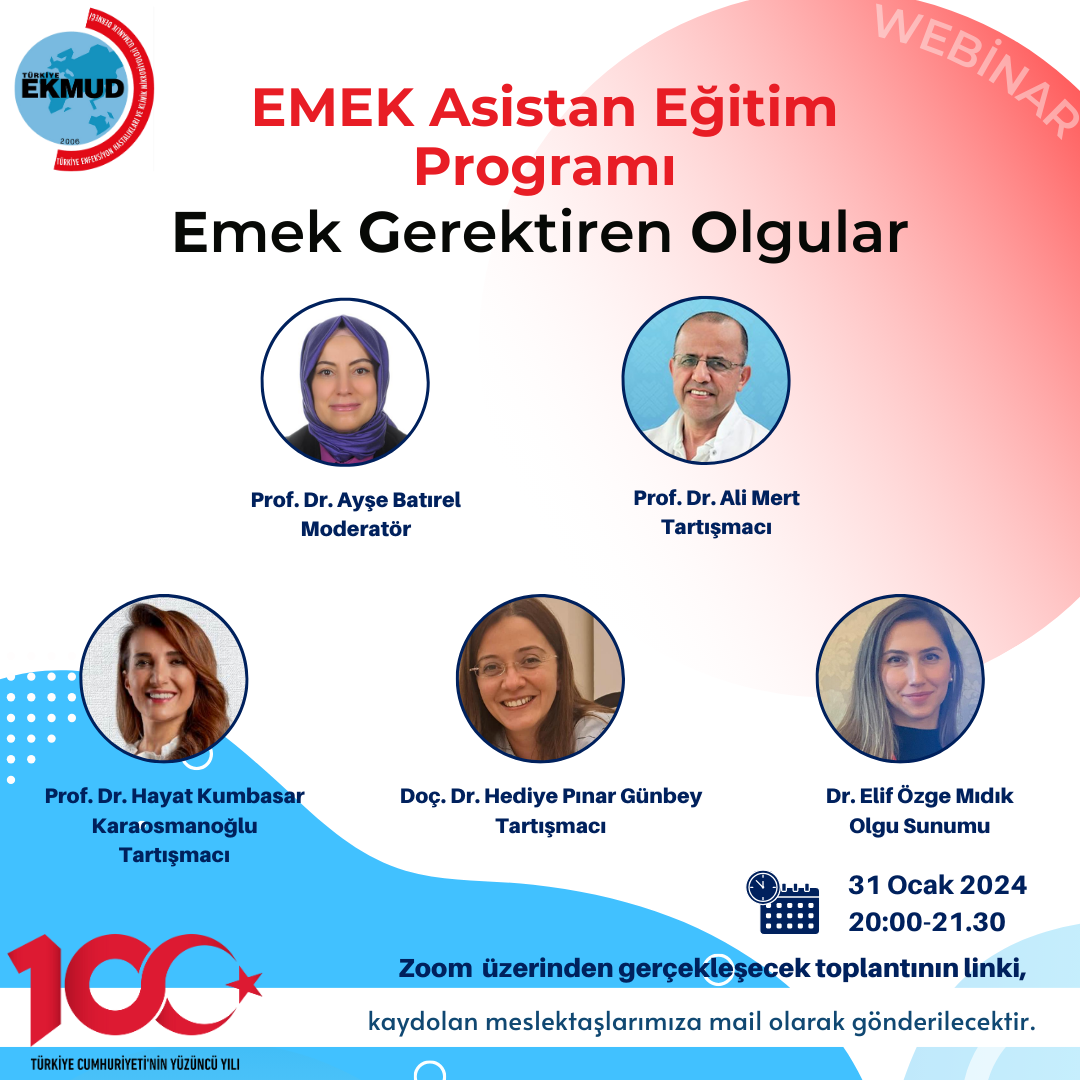 Emek Gerektiren Olgular (EGO) konulu toplantı 31 Ocak 2024, Çarşamba günü saat 20.00'da başlayacaktır. Toplantı, Prof. Dr. Ayşe Batırel moderatörlüğünde, Dr. Elif Özge Mıdık'ın olgu sunumu, Prof. Dr. Ali Mert, Prof. Dr. Hayat Kumbasar Karaosmanoğlu, Doç. Dr. Hediye Pınar Günbey tartışmacı olarak katılımı ile gerçekleşecektir.