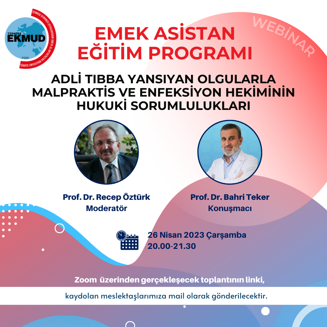 Adli Tıbba Yansıyan Olgularla Malpraktis ve Enfeksiyon Hekiminin Hukuki Sorumlulukları konulu toplantı 26 Nisan 2023, Çarşamba günü saat 20.00'da başlayacaktır. Toplantı, Prof. Dr. Recep Öztürk moderatörlüğünde ve Prof. Dr. Bahri Teker'in anlatımıyla gerçekleşecektir.