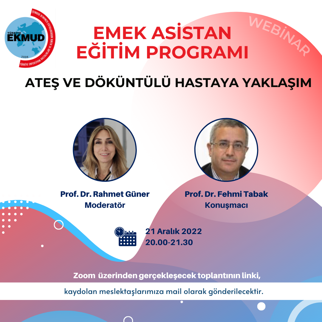 Ateş ve Döküntülü Hastaya Yaklaşım konulu toplantı 21 Aralık 2022, Çarşamba günü saat 20.00'da başlayacaktır. Toplantı, Prof. Dr. Rahmet Güner moderatörlüğünde ve Prof. Dr. Fehmi Tabak'ın anlatımıyla gerçekleşecektir.