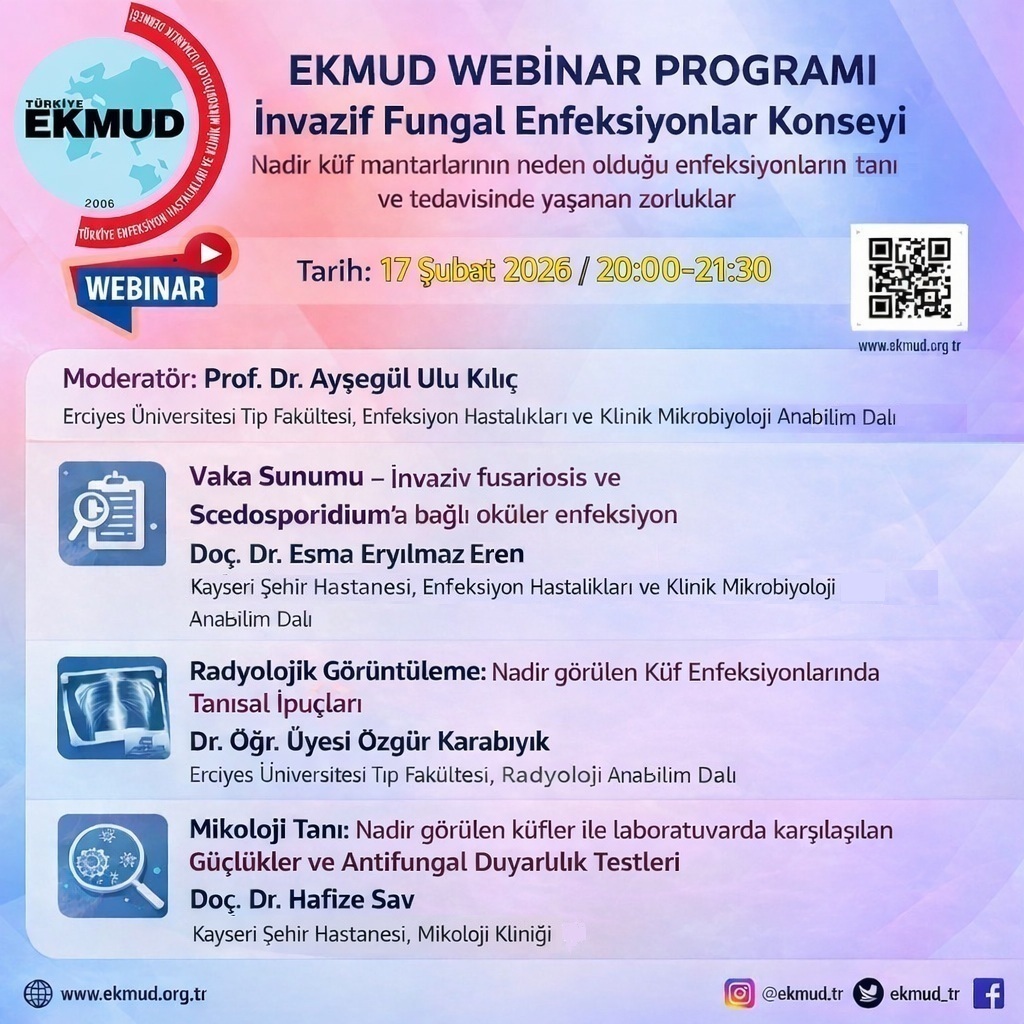 Türkiye EKMUD Invaziv Fungal Enfeksiyonlar Konseyi "Nadir küf mantarlarının neden olduğu enfeksiyonların tanı ve tedavisinde yaşanan zorluklar" konulu toplantımız 17 Şubat 2026 tarihinde saat 20.00-21.30'da gerçekleşecektir. Toplantımıza kayıt olmak için lütfen tıklayınız.