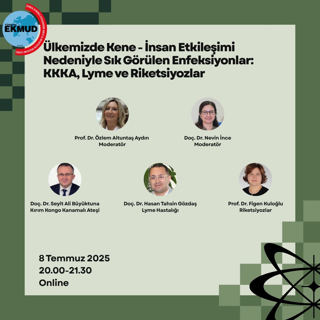 Kene kaynaklı enfeksiyonlar, ülkemizde halk sağlığı açısından önemli bir tehdit oluşturmaktadır. Bu kapsamda düzenlediğimiz webinarda, kene–insan etkileşimi sonucu sık görülen üç önemli enfeksiyon olan Kırım Kongo Kanamalı Ateşi (KKKA), Lyme hastalığı ve Riketsiyozlar güncel bilgiler ışığında ele alınacaktır.