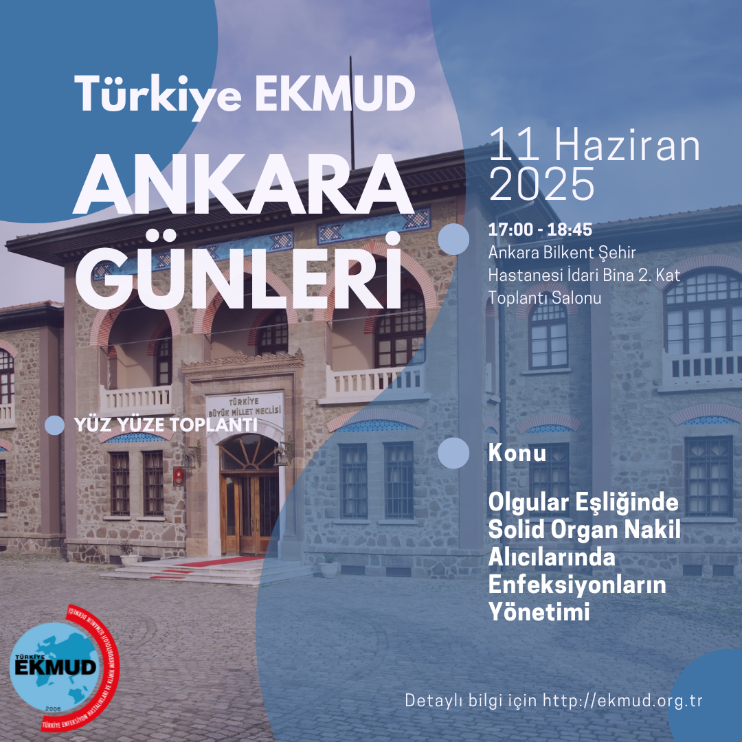 Türkiye EKMUD Ankara Günleri 11 Haziran 2025 tarihinde ‘Olgular Eşliğinde Solid Organ Nakil Alıcılarında Enfeksiyonların Yönetimi’ başlığıyla Ankara Bilkent Şehir Hastanesi İdari Bina 2. Kat Toplantı Salonu Bilkent/Ankara'da gerçekleştirilecektir. Toplantımıza tüm meslektaşlarımızı davet ediyor, birlikte olmayı diliyoruz.