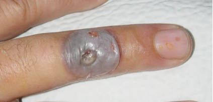 - Fizik muayenede; sol el 4. parmağında hassas, ortası mor, nekroze, etrafı kirli beyaz halkalı lezyon gözlendi. (Şekil 1)
