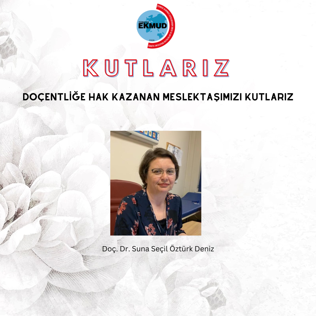 Pamukkale Üniversitesi, Enfeksiyon Hastalıkları ve Klinik Mikrobiyoloji Anabilim Dalı öğretim görevlilerinden Dr. Suna Seçil Öztürk Deniz Doçentlik ünvanına hak kazanmıştır. Türkiye EKMUD Yönetim Kurulu, Çanakkale'de bulunan EKMUD Ormanına, Tema Vakfı aracılığıyla meslektaşımızın adına fidan dikmiştir. Sn. Doç. Dr. Suna Seçil Öztürk Deniz'i yeni kariyerinden dolayı tebrik eder, başarılar dileriz.