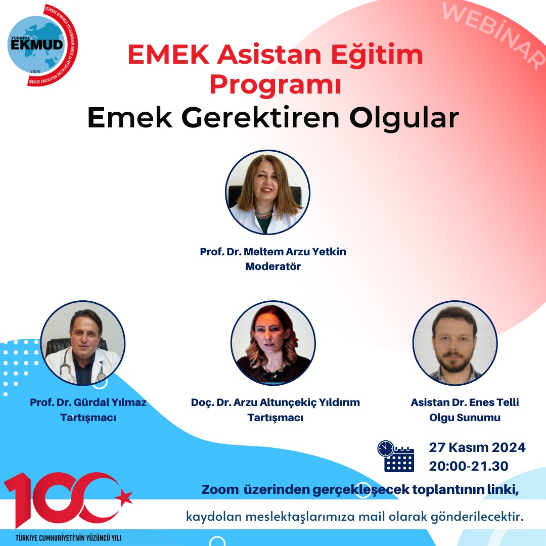 Emek Gerektiren Olgular (EGO) 27 Kasım 2024, Çarşamba günü 20.00- 21.30'da yapılacaktır. Toplantı, Prof. Dr. Meltem Arzu Yetkin’in moderatörlüğünde, Dr. Enes Telli'nin olgu sunumu ve Prof. Dr. Gürdal Yılmaz ve Doç. Dr. Arzu Altunçekiç Yıldırım'ın tartışmacı olarak katılımı ile gerçekleşecektir.
