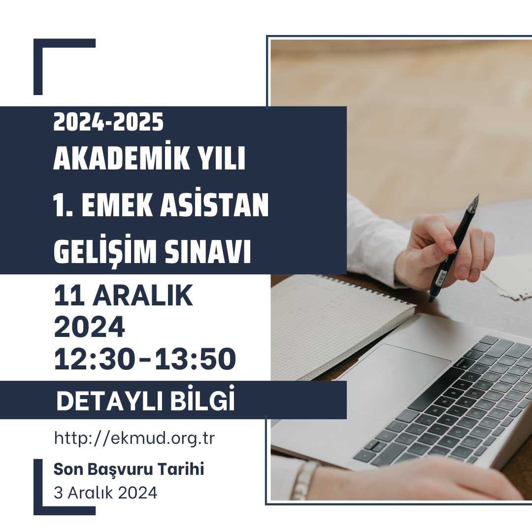 2024-2025 Akademik Yılı 1. EMEK Asistan Gelişim Sınavı, 11 Aralık 2024 Çarşamba günü, 12:30 - 13:50 saatleri arasında, online olarak gerçekleştirilecektir.