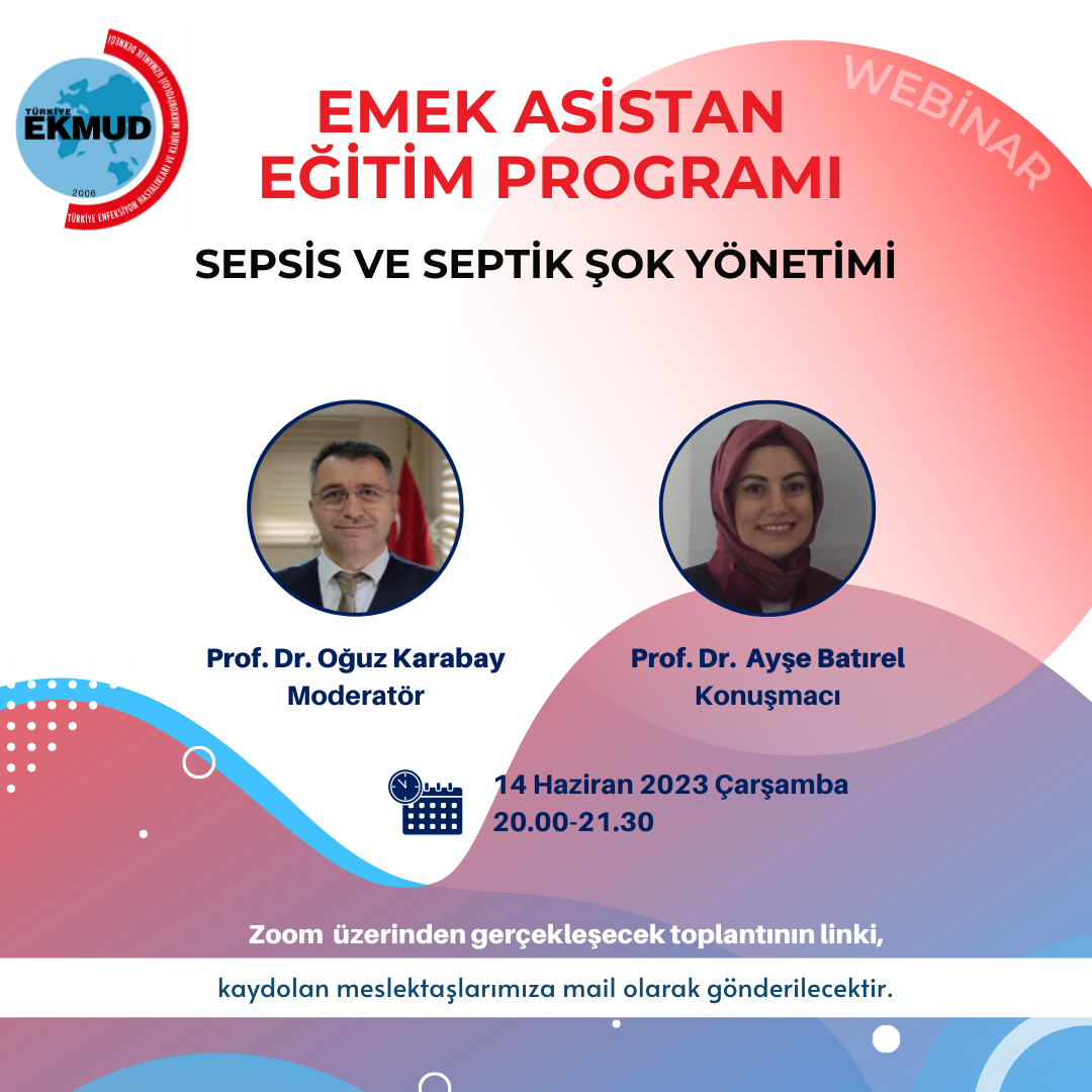 Sepsis ve Septik Şok Yönetimi konulu toplantı 14 Haziran 2023, Çarşamba günü saat 20.00'da başlayacaktır. Toplantı, Prof. Dr. Oğuz Karabay moderatörlüğünde ve Prof. Dr. Ayşe Batırel'in anlatımıyla gerçekleşecektir.