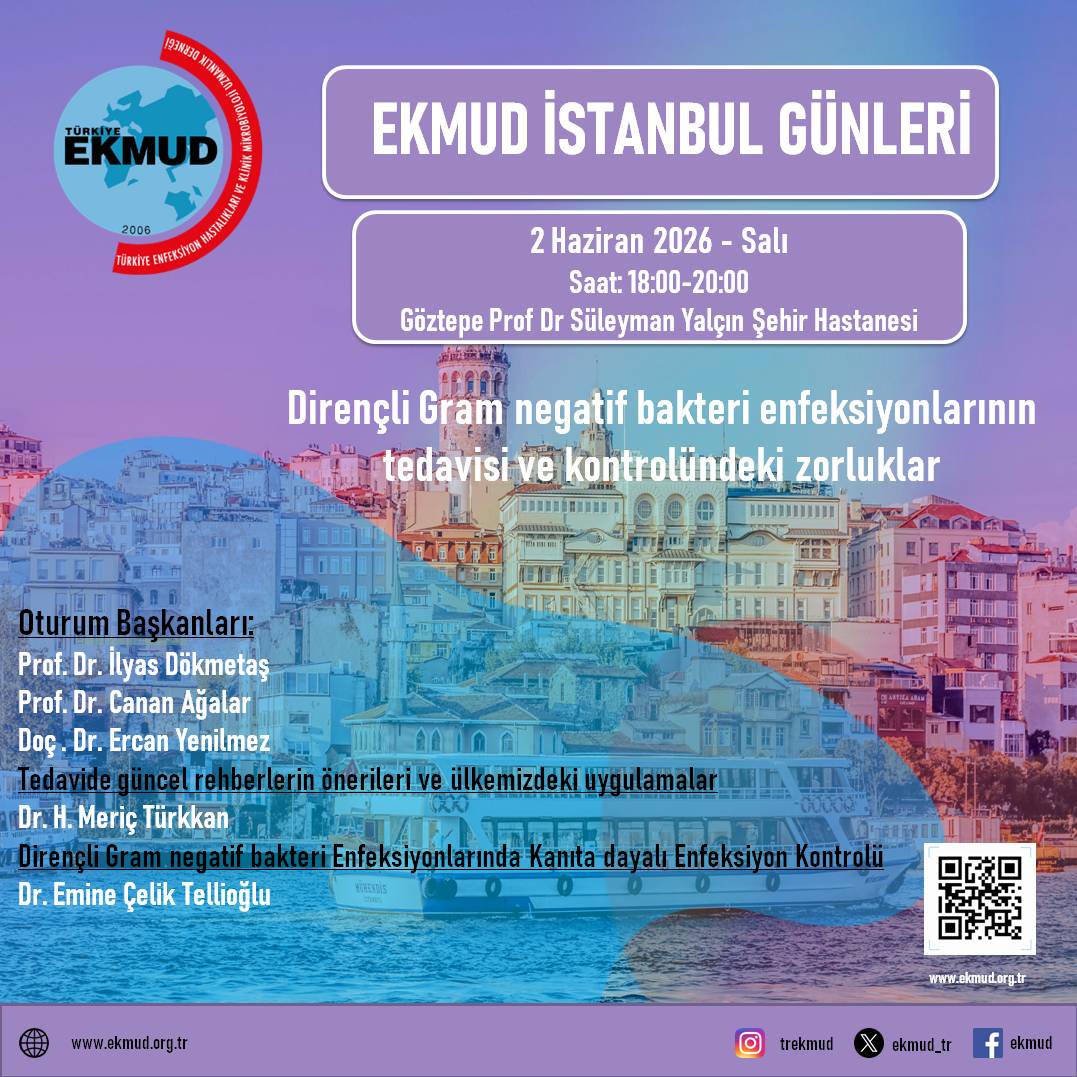 Türkiye EKMUD İstanbul Günleri 2025 - 2026 Eğitim Dönemi Programımız “Enfeksiyon Hastalıkları Pratiğimizde Karşılaştığımız Zorluklar” teması ile, 2 Haziran 2026 tarihinde “Dirençli Gram negatif bakteri enfeksiyonlarının tedavisi ve kontrolündeki zorluklar” başlığıyla, Göztepe Prof Dr Süleyman Yalçın Şehir Hastanesi Toplantı Salonu - İstanbul’da gerçekleştirilecektir. Toplantımıza tüm meslektaşlarımızı davet ediyor, birlikte olmayı diliyoruz.