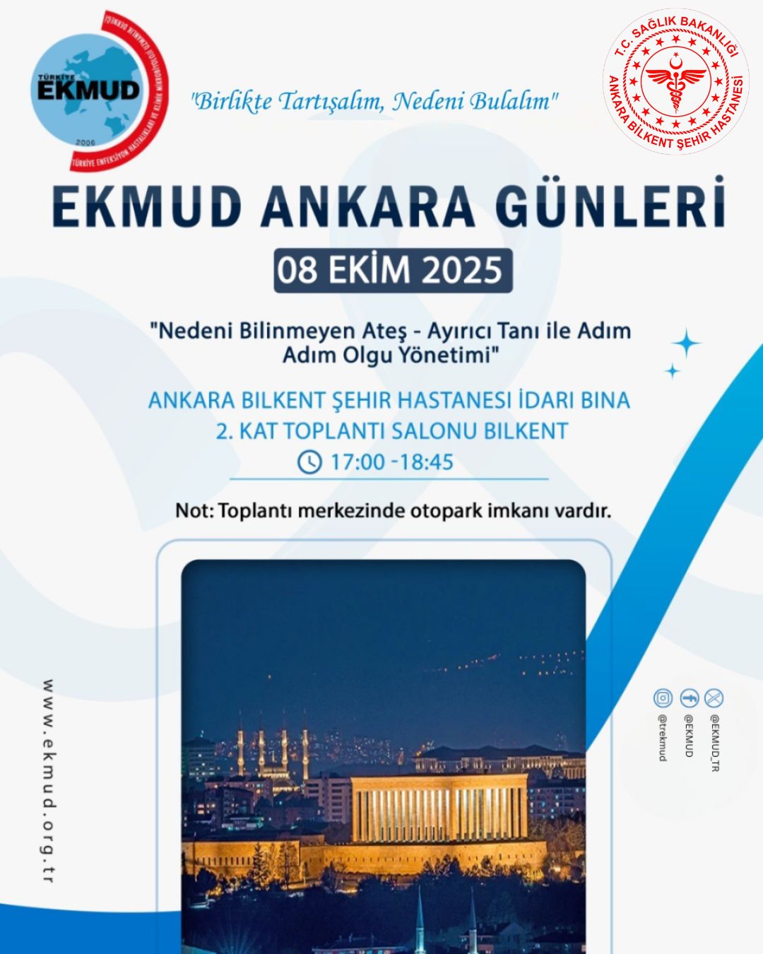 Türkiye EKMUD Ankara Günleri 2025 - 2026 Eğitim Yılı Programımız ‘’Birlikte Tartışalım, Nedeni Bulalım" teması ile 8 Ekim 2025 tarihinde, "Nedeni Bilinmeyen Ateş - Ayırıcı Tanı ile Adım Adım Olgu Yönetimi" başlığıyla Ankara Bilkent Şehir Hastanesi İdari Bina 2. Kat Toplantı Salonu Bilkent/Ankara'da gerçekleştirilecektir. Toplantımıza tüm meslektaşlarımızı davet ediyor, birlikte olmayı diliyoruz.