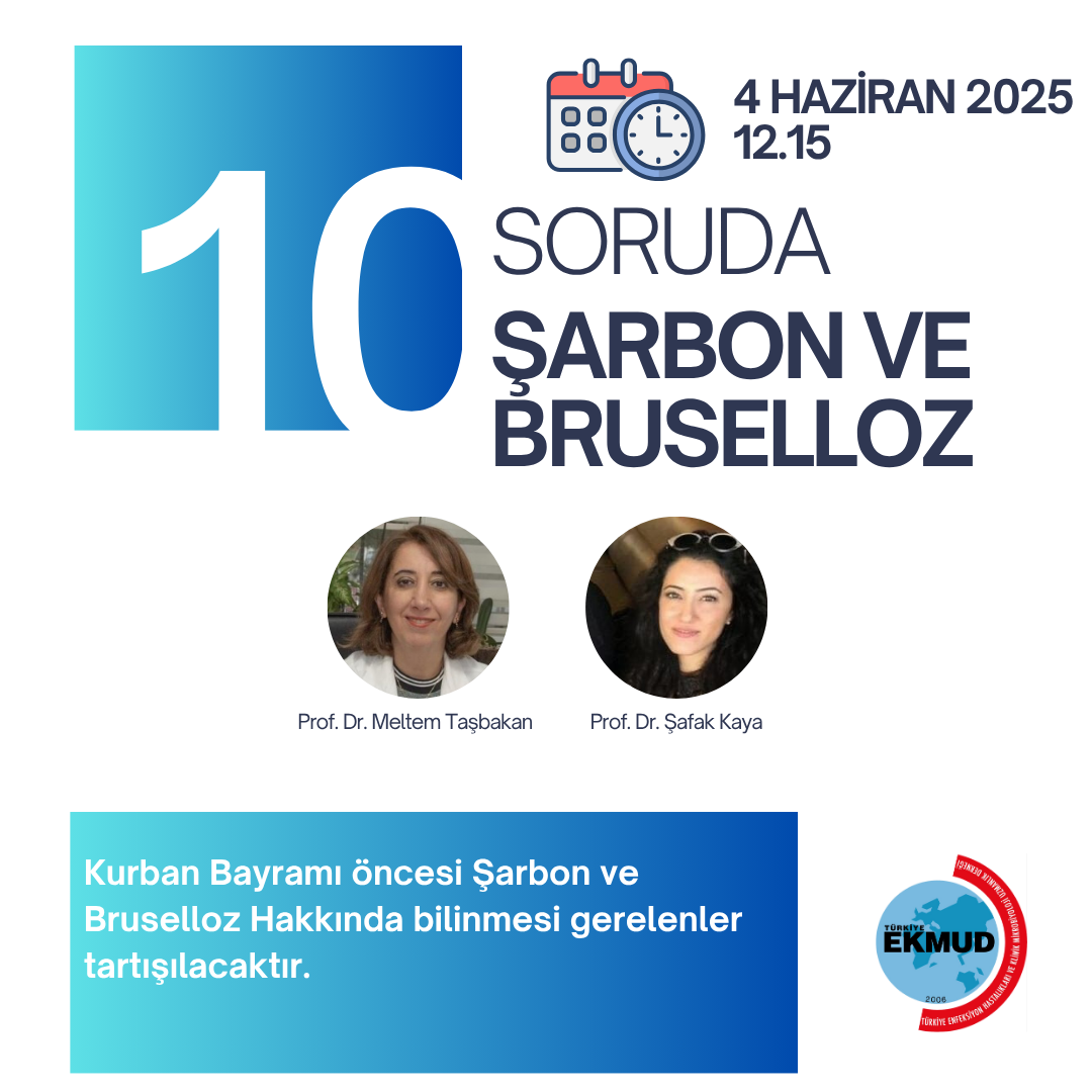 Türkiye EKMUD Başkanımız Prof. Dr. Meltem Taşbakan'ın moderatörlüğünde, Kurban Bayramı Öncesi 10 soruda Şarbon ve Bruselloz konulu etkinliğimizde, Prof. Dr. Meltem Taşbakan ve Prof. Dr. Şafak Kaya 4 Haziran 2025 Çarşamba günü saat 12.15'te derneğimizin Instagram hesabında (@trekmud) konuyu tartışacaklar.