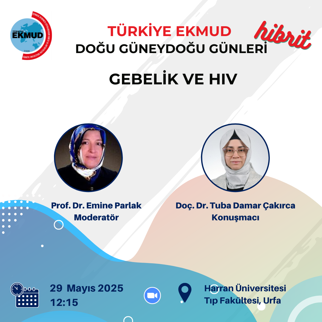 Türkiye EKMUD Doğu Güneydoğu Anadolu Günleri 29 Mayıs 2025 tarihinde "Gebelik ve HIV" başlığıyla gerçekleştirilecektir. Moderatörlüğünü Prof. Dr. Emine Parlak'ın yapacağı toplantıda, Doç. Dr. Tuba Damar Çakırca “Gebelik ve HIV” konusunu ele alacaktır.