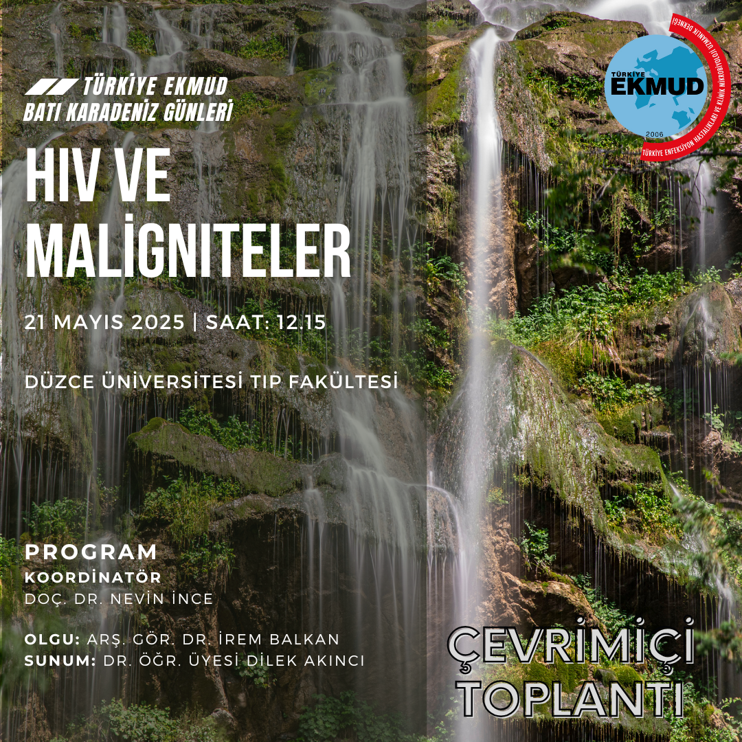 Türkiye EKMUD Batı Karadeniz Günleri toplantısı 21 Mayıs 2025 günü, saat 12.15'te “HIV ve Maligniteler“ başlığıyla çevrimiçi olarak gerçekleştirilecektir. Toplantımız Doç. Dr. Nevin İnce moderatörlüğünde, Arş. Gör. Dr. İrem Balkan'ın olgu sunumu ve Dr. Öğr. Üyesi Dilek Akıncı'nın konu anlatımıyla yapılacaktır. Toplantımıza tüm meslektaşlarımızı davet ediyor, birlikte olmayı diliyoruz.