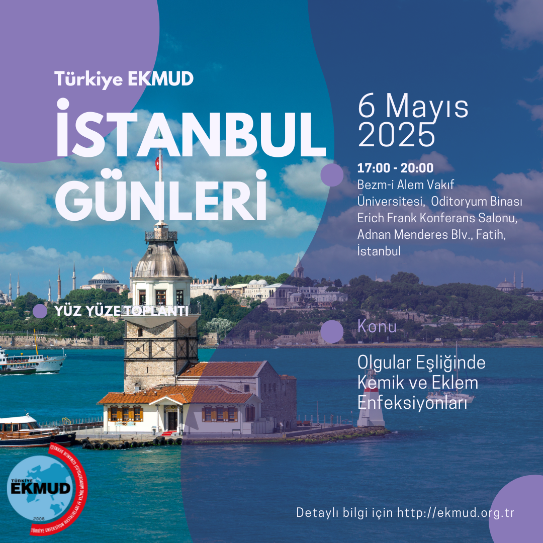 Türkiye EKMUD İstanbul Günleri 6 Mayıs 2025 tarihinde Bezm-i Alem Vakıf Üniversitesi, Oditoryum Binası Erich Frank Konferans Salonu, Adnan Menderes Blv., Fatih, İstanbul'da Olgular Eşliğinde Kemik ve Eklem Enfeksiyonları başlığı ile gerçekleştirilecektir.