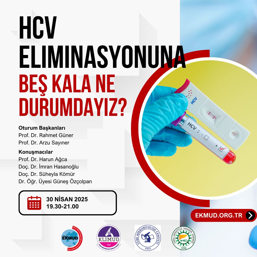 Hepatit C virüsüne karşı yürütülen eliminasyon çalışmalarında gelinen noktayı değerlendirmek amacıyla, EKMUD, KLİMUD, TMC ve VHSD derneklerinin iş birliğinde düzenlenen bu çevrim içi toplantıya sizleri davet ediyoruz. Toplantıda, tanıdan tedaviye uzanan süreçte elde edilen başarılar ve karşılaşılan zorluklar ele alınacak; laboratuvar ve klinik uygulamalara dair güncel bilgiler paylaşılacaktır.