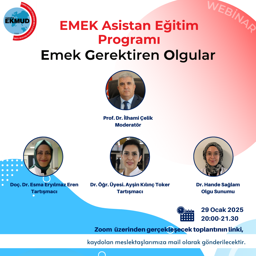 Emek Gerektiren Olgular (EGO) 29 Ocak 2025, Çarşamba günü 20.00- 21.30'da yapılacaktır. Toplantı, Prof. Dr. İlhami Çelik’in moderatörlüğünde, Dr Hande Sağlam'ın olgu sunumu ve Doç. Dr. Esma Eryılmaz Eren ve Dr. Öğr. Üyesi Ayşin Kılınç Toker'in tartışmacı olarak katılımı ile gerçekleşecektir.
