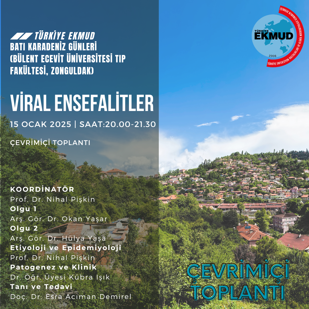Türkiye EKMUD Batı Karadeniz Günleri toplantısı 15 Ocak 2025 günü, saat 20:00'da “Viral Ensefalitler“ başlığıyla çevrimiçi olarak gerçekleştirilecektir. Toplantımız Prof. Dr. Nihal Pişkin moderatörlüğünde, Arş. Gör. Dr. Okan Yaşar ve Arş. Gör. Dr. Hülya Yaşa'nın olgu sunumları ve Prof. Dr. Nihal Pişkin, Dr. Öğr. Üyesi Kübra Işık, Doç. Dr. Esra Acıman Demirel konu anlatımıyla yapılacaktır. Toplantımıza tüm meslektaşlarımızı davet ediyor, birlikte olmayı diliyoruz.
