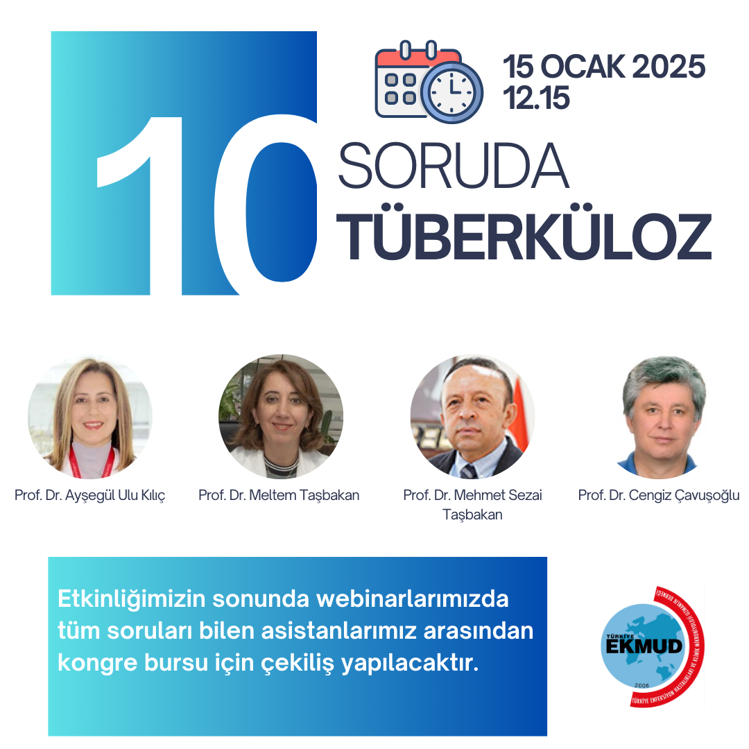 Prof. Dr. Meltem Taşbakan, Prof. Dr. Ayşegül Ulu Kılıç, Prof. Dr. Mehmet Sezai Taşbakan ve Prof. Dr. Cengiz Çavuşoglu'nun konuşmacı olarak katılacağı “10 Soruda Tüberküloz” konulu Instagram canlı yayını, 15 Ocak 2025 tarihinde, saat 12.15'te yapılacaktır.