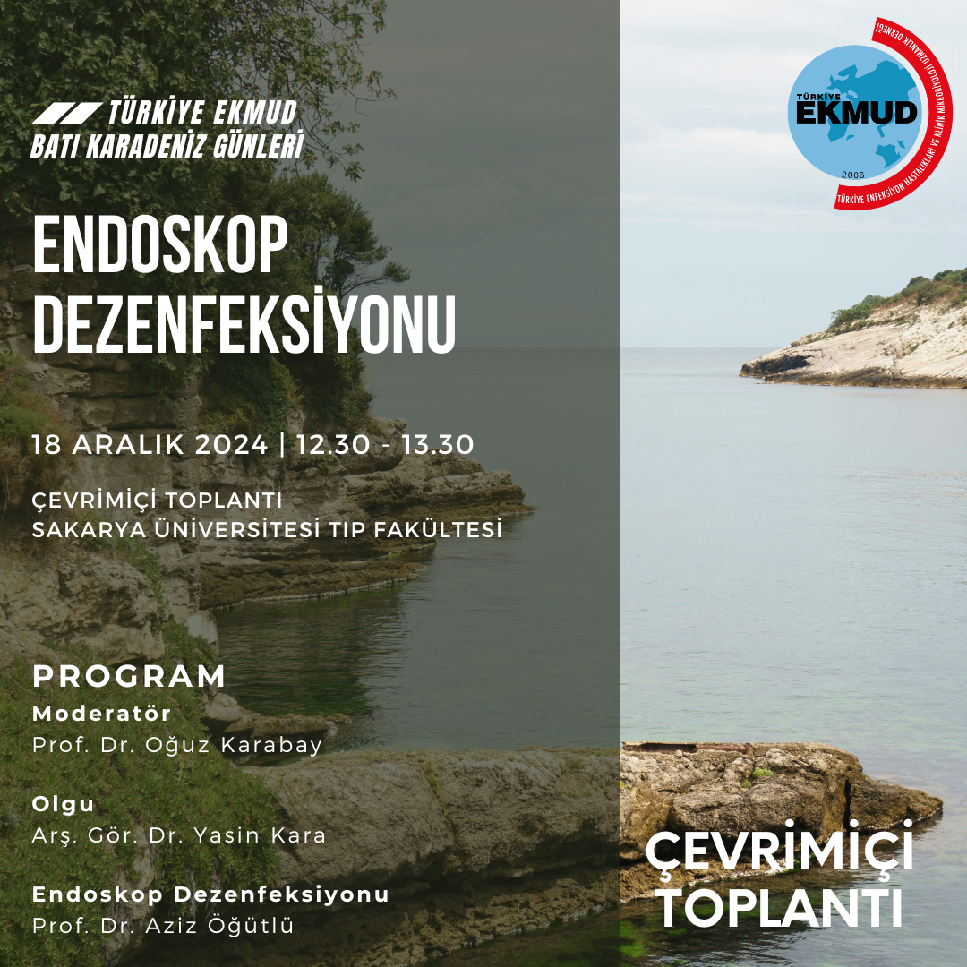 Türkiye EKMUD Batı Karadeniz Günleri toplantısı 18 Aralık 2024 günü, saat 12:30'da “Endoskop Dezenfeksiyonu“ başlığıyla çevrimiçi olarak gerçekleştirilecektir. Toplantımız Prof. Dr. Oğuz Karabay moderatörlüğünde, Prof. Dr. Aziz Öğütlü ve Arş. Gör. Dr. Yasin Kara'nın sunumlarıyla yapılacaktır. Toplantımıza tüm meslektaşlarımızı davet ediyor, birlikte olmayı diliyoruz.
