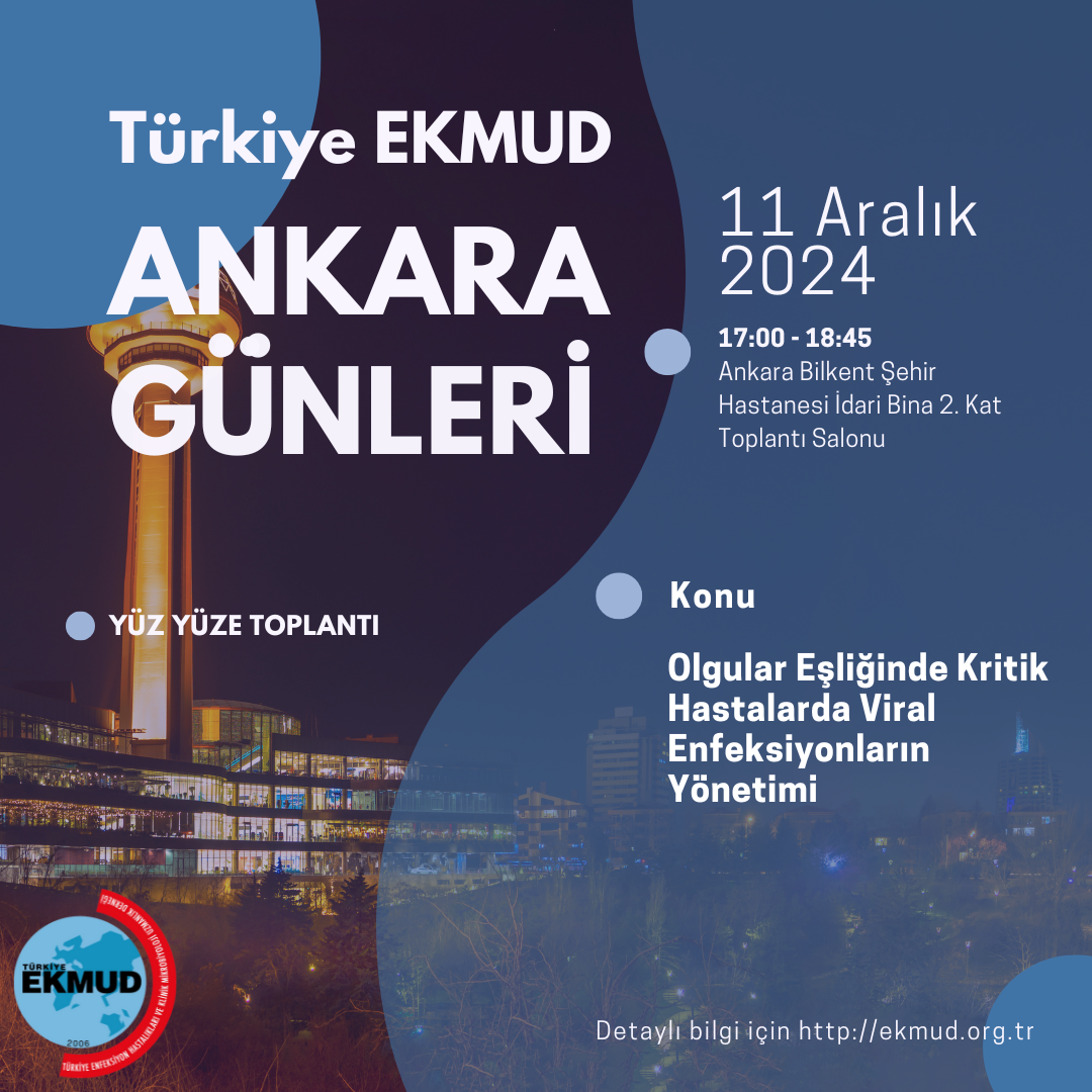 Türkiye EKMUD Ankara Günleri 11 Aralık 2024 tarihinde "Olgular Eşliğinde Kritik Hastalarda Viral Enfeksiyonların Yönetimi"başlığıyla Ankara Bilkent Şehir Hastanesi İdari Bina 2. Kat Toplantı Salonu Bilkent/Ankara'da gerçekleştirilecektir. Toplantımıza tüm meslektaşlarımızı davet ediyor, birlikte olmayı diliyoruz.