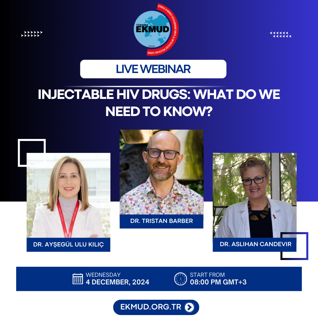 Türkiye EKMUD tarafından düzenlenen Injectable HIV drugs: What do we need to know? webinarında, HIV tedavisinde enjeksiyon yoluyla uygulanan ilaçlar hakkında en güncel bilgileri edinin. Dr. Tristan Barber, bu yenilikçi tedavi yönteminin avantajlarını, uygulama süreçlerini ve klinik deneyimlerini paylaşacaktır.