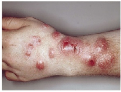 40 yaşında erkek hasta, “pet-shop”da çalışıyor, evcil hayvan teması var, ateşi olmamış, vücunda resimde görülen yaygın nodüler lezyonları mevcut. Bu hastada etken mikroorganizma aşağıdakilerden hangisi olabilir?